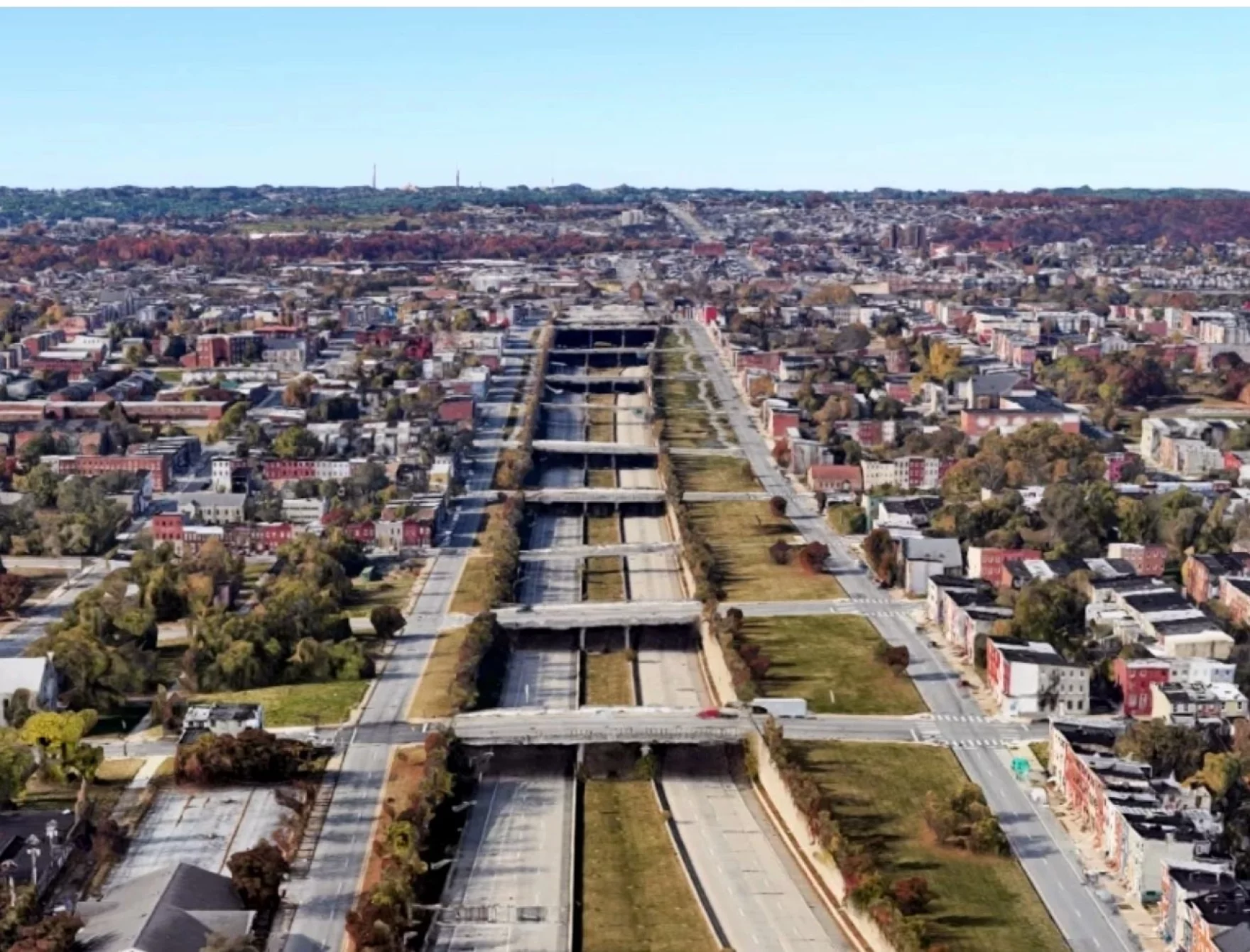 The "Highway to Nowhere," or I-170, was designed to connect downtown Baltimore to suburban interstates but disproportionately targeted Black neighborhoods in West Baltimore for demolition. Construction in the late 1960s destroyed 20 city blocks, including 971 homes, 62 businesses, and a school, displacing more than 1,500 residents from middle-class Black communities. Though the freeway was never completed, neighborhoods like Harlem Park and Franklin-Mulberry were devastated, and the destruction from eminent domain and demolition left lasting physical and symbolic barriers that still hinder economic growth and connectivity.